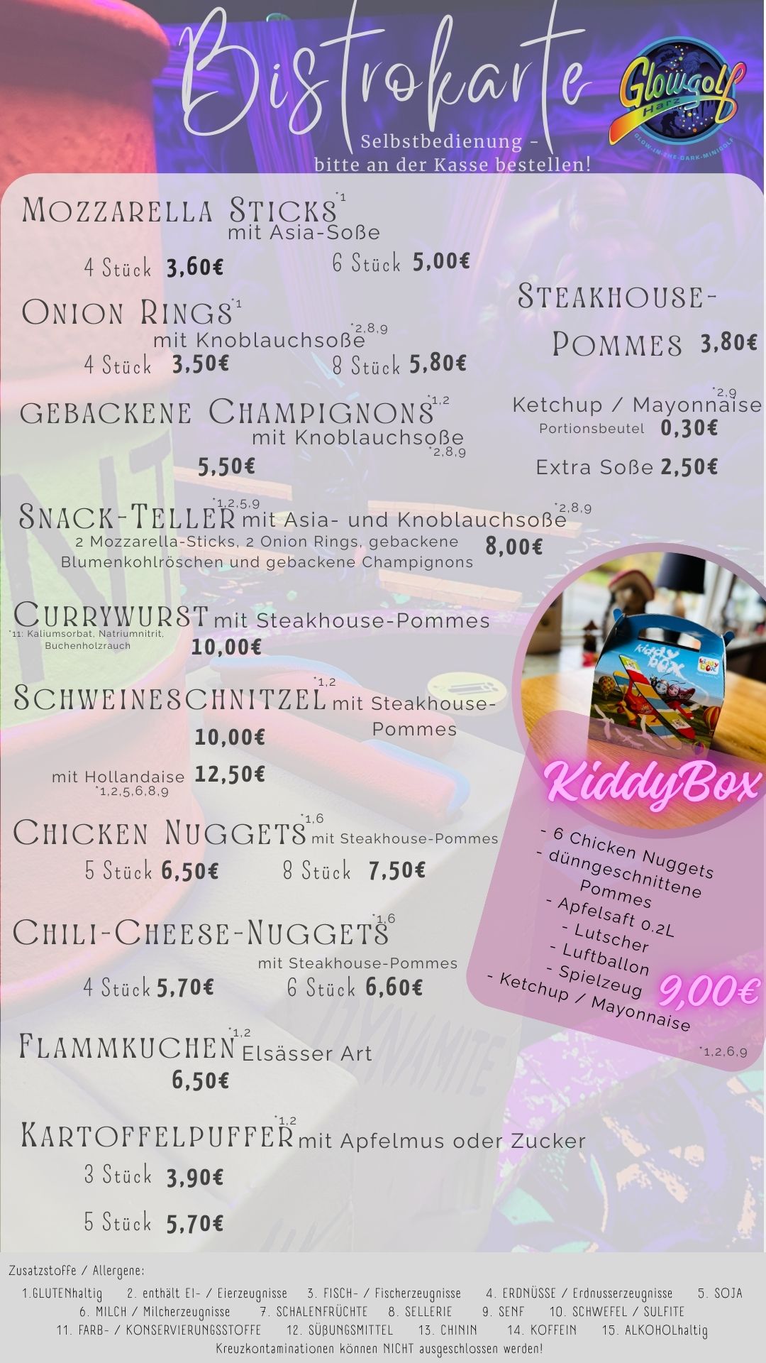 Gestalte deinen Besuch bei uns zu einem exklusiven Minigolf-Event, das in Erinnerung bleibt! Unsere Glowgolf-Anlage bietet Spaß für Jung und Alt und ist der perfekte Ort für Kindergeburtstage, Familientreffen, Firmenfeiern, etc. Im Anschluss an das Spiel lädt unser Bistro zum Genießen und Entspannen ein. Für Geburtstagskinder ist das Spiel kostenfrei. Bitte denkt daran, rechtzeitig die Kindergeburtstage zu buchen.